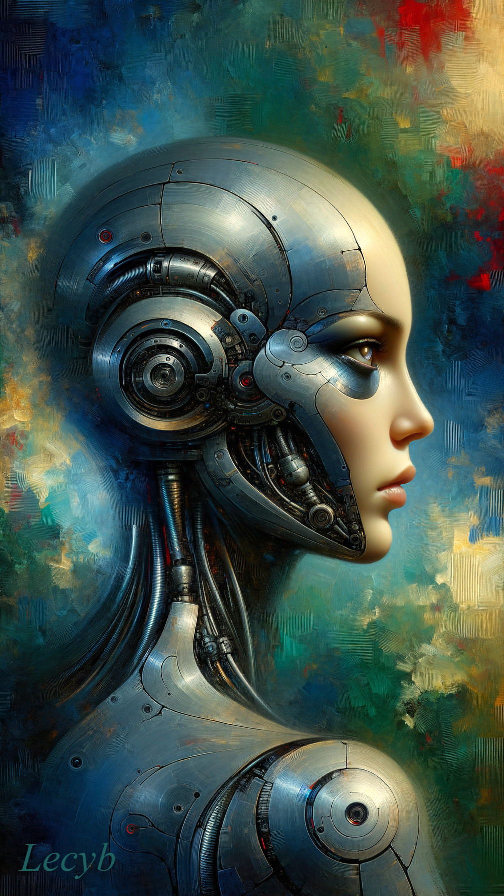 A futuristic, humanoid robot with sleek metallic features and a smooth, stylized face. Its complex circuitry is visible, set against a colorful abstract background.