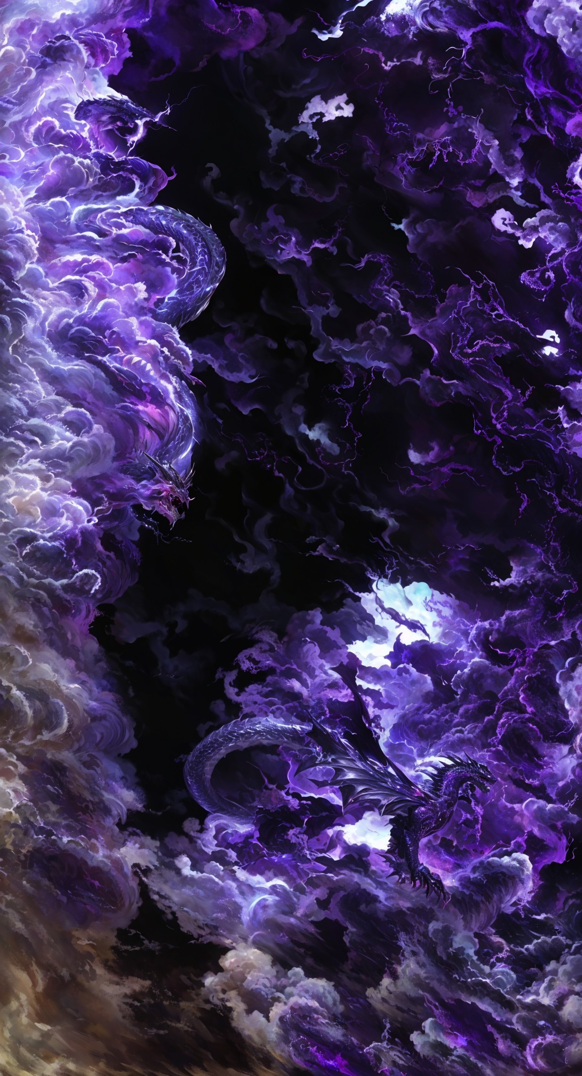 + Prompt:Generate an illustration of a majestic dragon, its body coiling through a stormy sky filled with purple and dark clouds. The dragon has iridescent scales that shimmer with hints of blue and silver, showcasing an intricate pattern along its long, serpentine form. Its head features fierce, pronounced facial features with sharp eyes glowing brightly, creating an intense expression. The dragon's mane flows dramatically, almost like wisps of smoke, while its mouth is partially open, revealing sharp teeth.