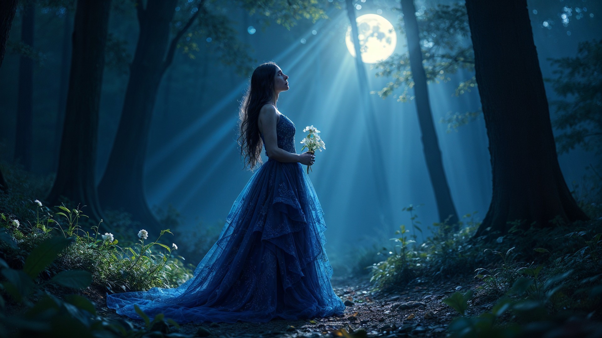 A silhouette of a woman in a flowing blue gown stands in a moonlit forest, holding a glowing flower. The enchanting scene is filled with ethereal light and shadow, creating a magical atmosphere.