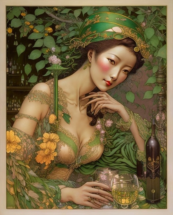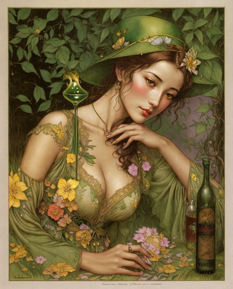 + Prompt:Beautiful woman at an absinthe bar. Deep brown, lemon yellow, olive green, grass green She Beauty is upon you like the dew on grass each morn.