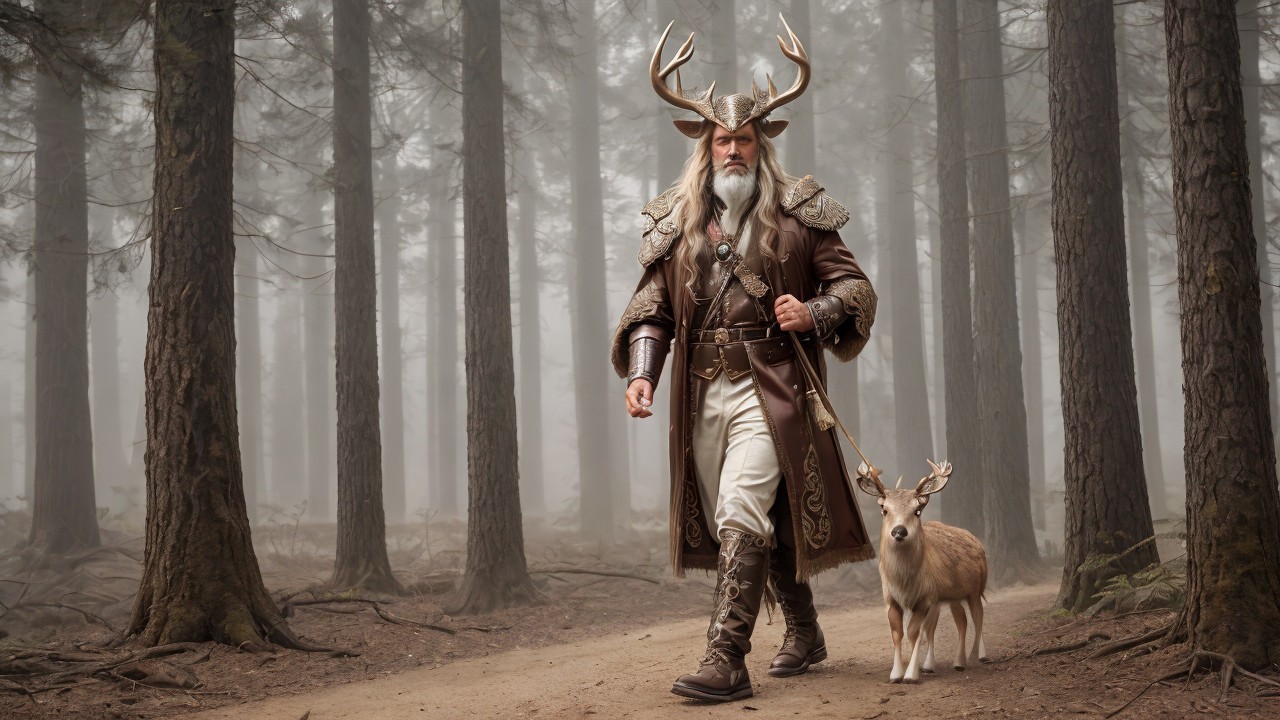 A majestic figure with antlers and a blue crown walks through a misty forest, donned in regal attire with fur accents. A gentle deer accompanies him, enhancing the enchanting atmosphere.