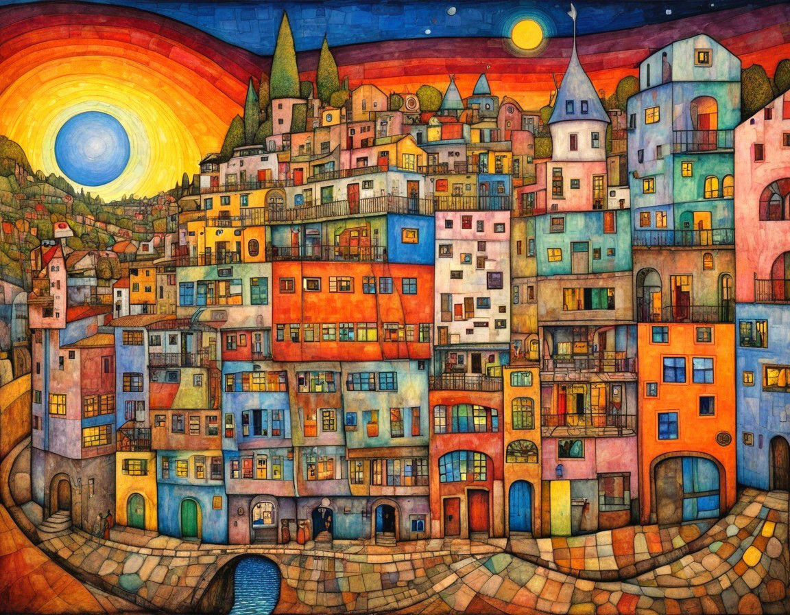 A vibrant, colorful cityscape with abstract buildings and winding paths under a dramatic sunset. The artwork features a playful mix of shapes, details, and a bright sun in the background.