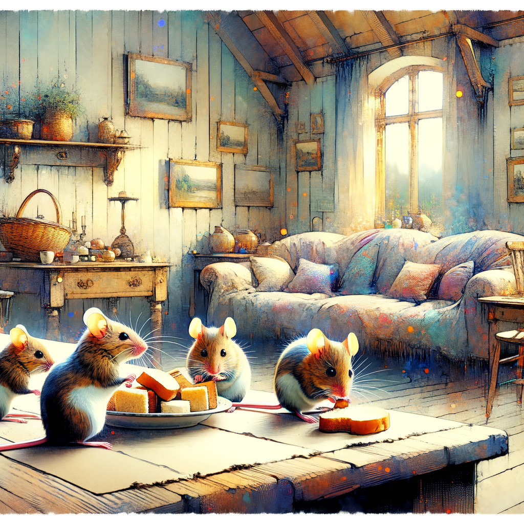 Three mice sit on a table inside a cozy parlor where they have found some unattended goodies - the feast begins.