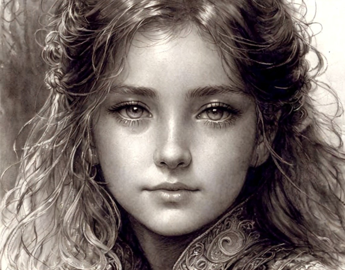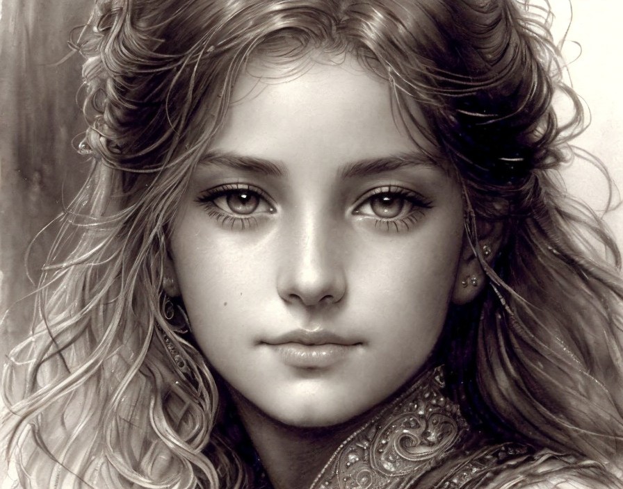 Prompt: A pencil and charcoal line sketch portrait of a beautiful young girl, big brown sparkling eyes, slight smile, fantasy clothes, messy hairstyle, intricate details and precisely drawn cross-hatching lines throughout the drawing, bold lines. Color.