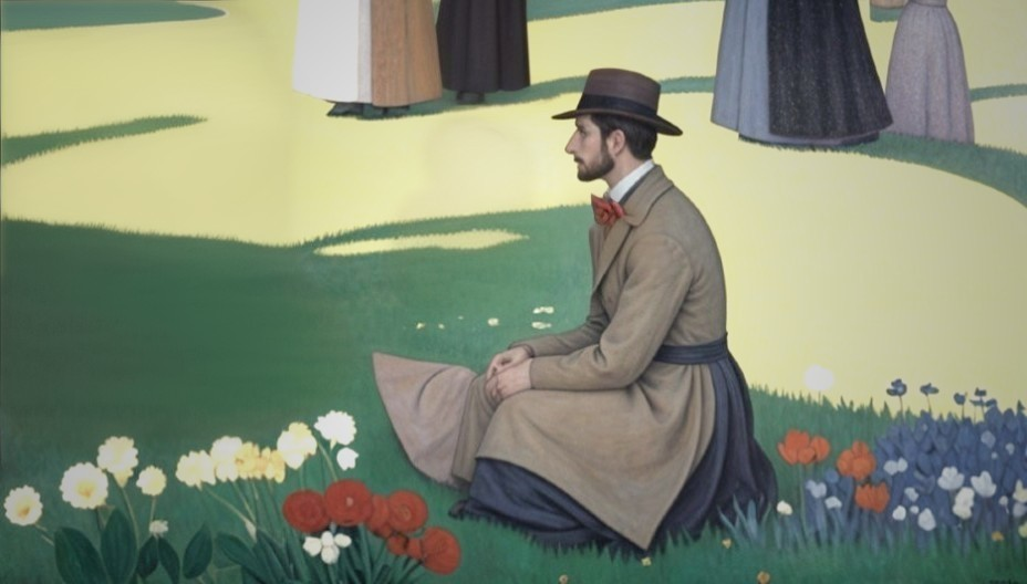 A young girl sits on a grassy patch adorned with yellow flowers, her bare feet resting on the ground. She wears a simple gray dress and gazes thoughtfully, surrounded by trees in a serene setting.