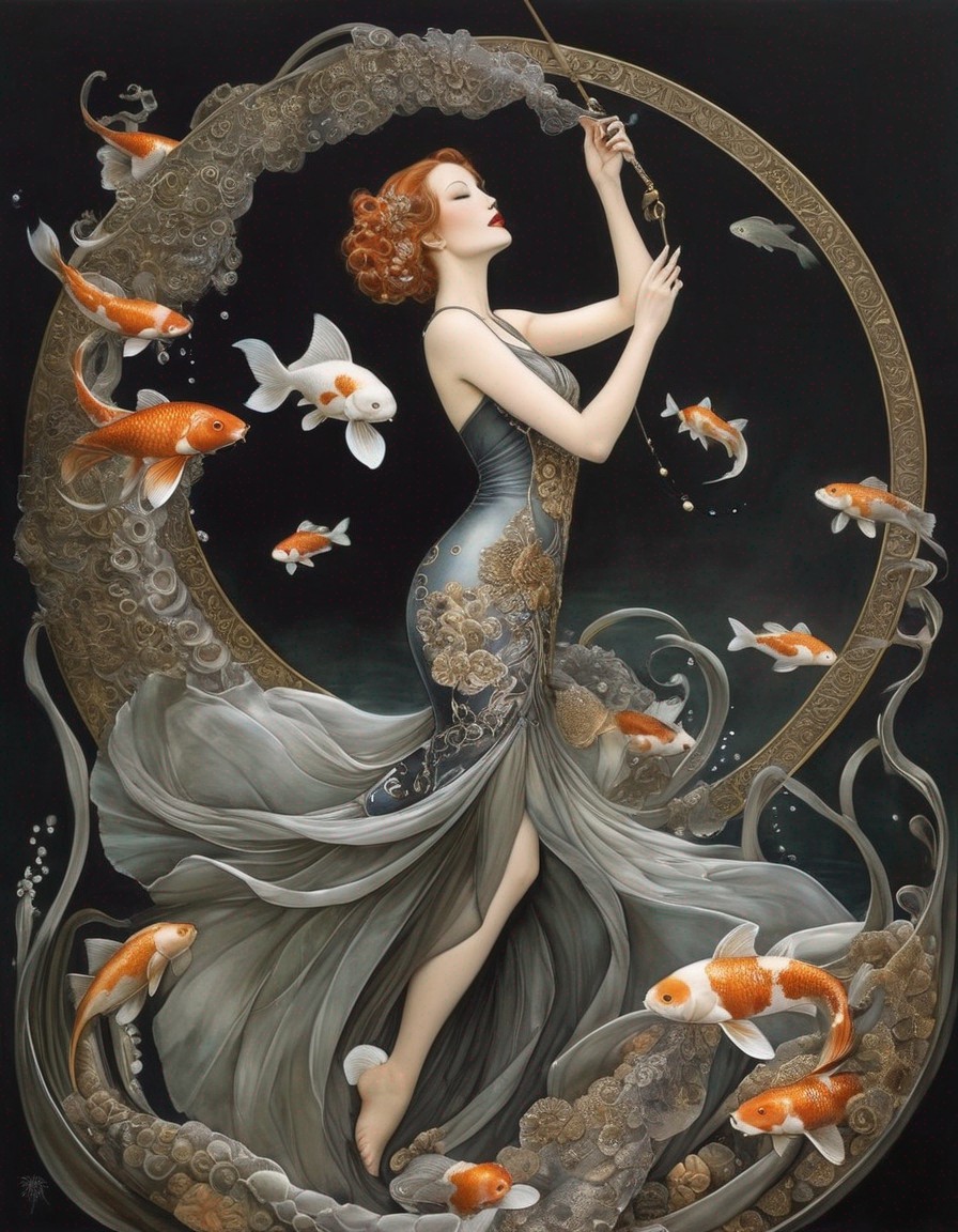 An ethereal woman floats in water, adorned in a golden fish-patterned dress, interacting gracefully with a large, vibrant koi fish amidst delicate bubbles.