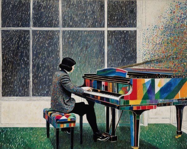 Prompt: Christian Schloe, Tom Everhart, Cy Twombly, David Downton, El Anatsui, Philip Taaffe, Jan Toorop, Koloman Moser: woman sitting at an open window, with rain outside