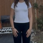 A fierce young woman stands confidently in the rain, wearing a black leather jacket and a choker. Her striking blue eyes and determined expression convey strength amid a moody urban backdrop.