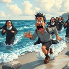 A panicked young man sprints along a beach, chased by a group of animated nuns. The ocean waves crash nearby under a bright sky, creating a humorous and chaotic scene.