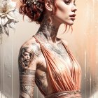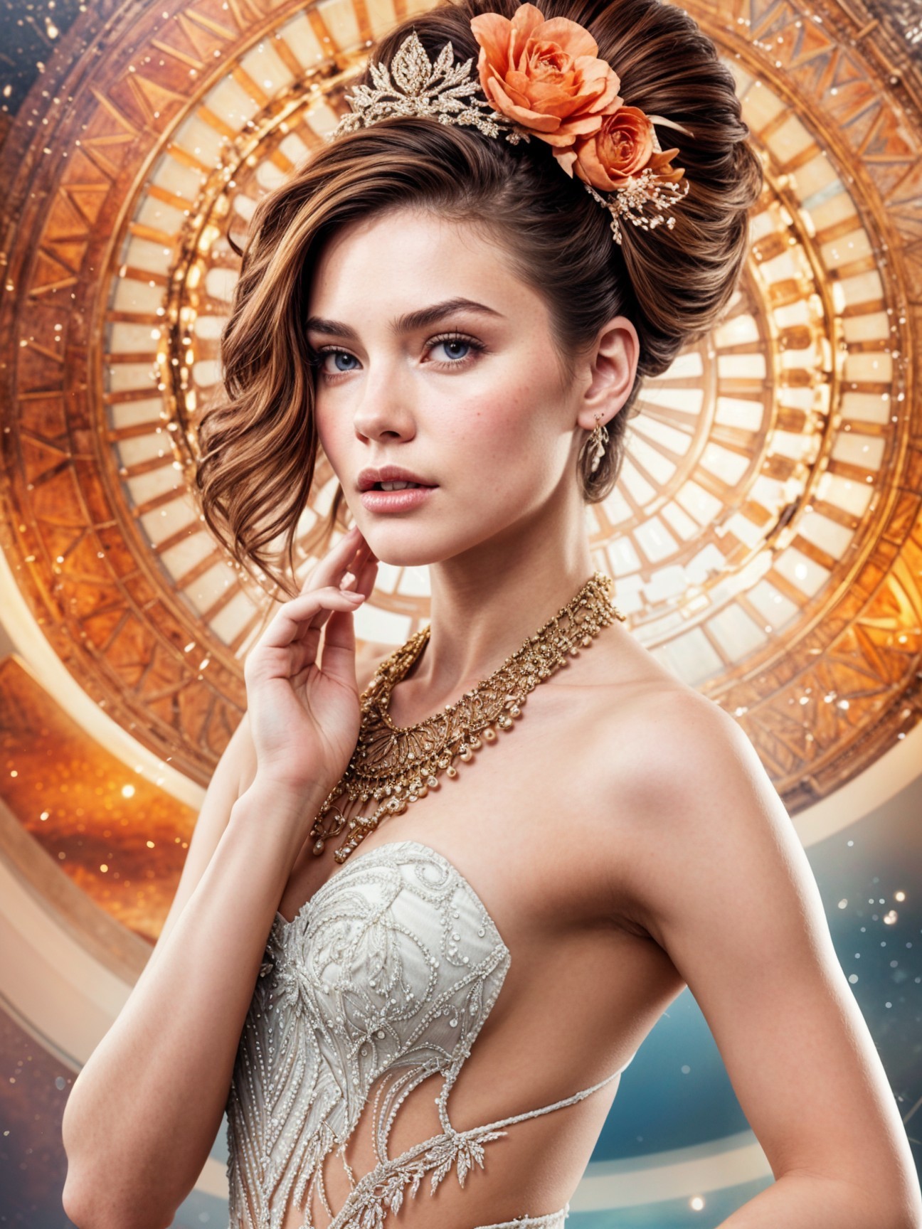 A young woman adorned in a glamorous gold gown, featuring intricate details and floral embellishments. She wears elegant jewelry and has roses in her hair, radiating beauty and grace.