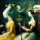 Stylized Figures in Vibrant Gowns with Surreal Elements