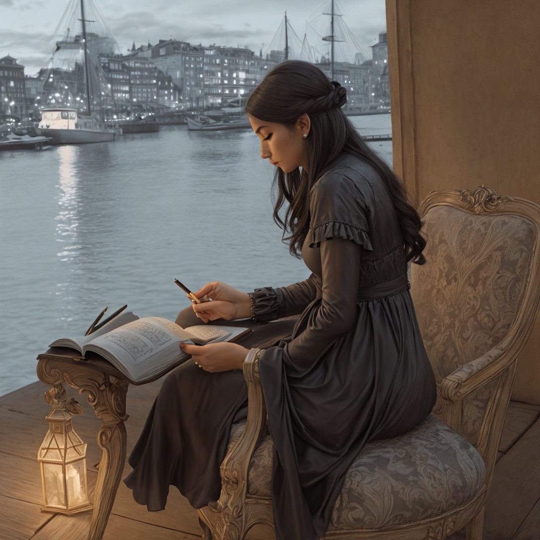 Woman in vintage dress journaling by lantern on balcony