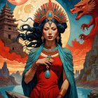 Mystical Scene with Woman in Red Gown and Dragon