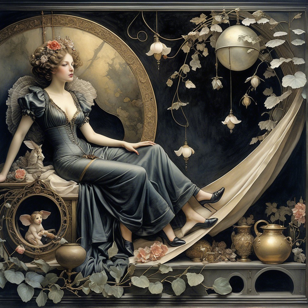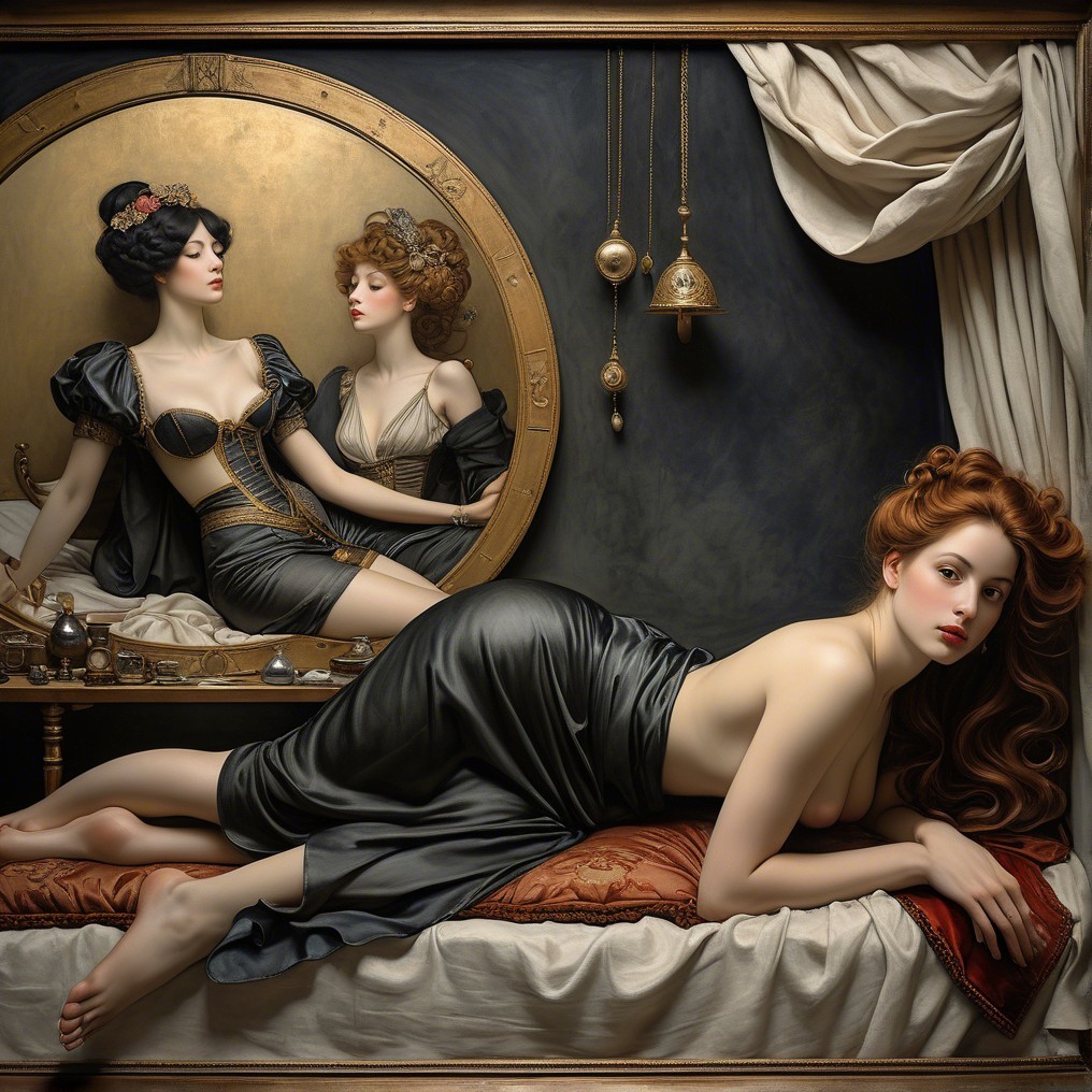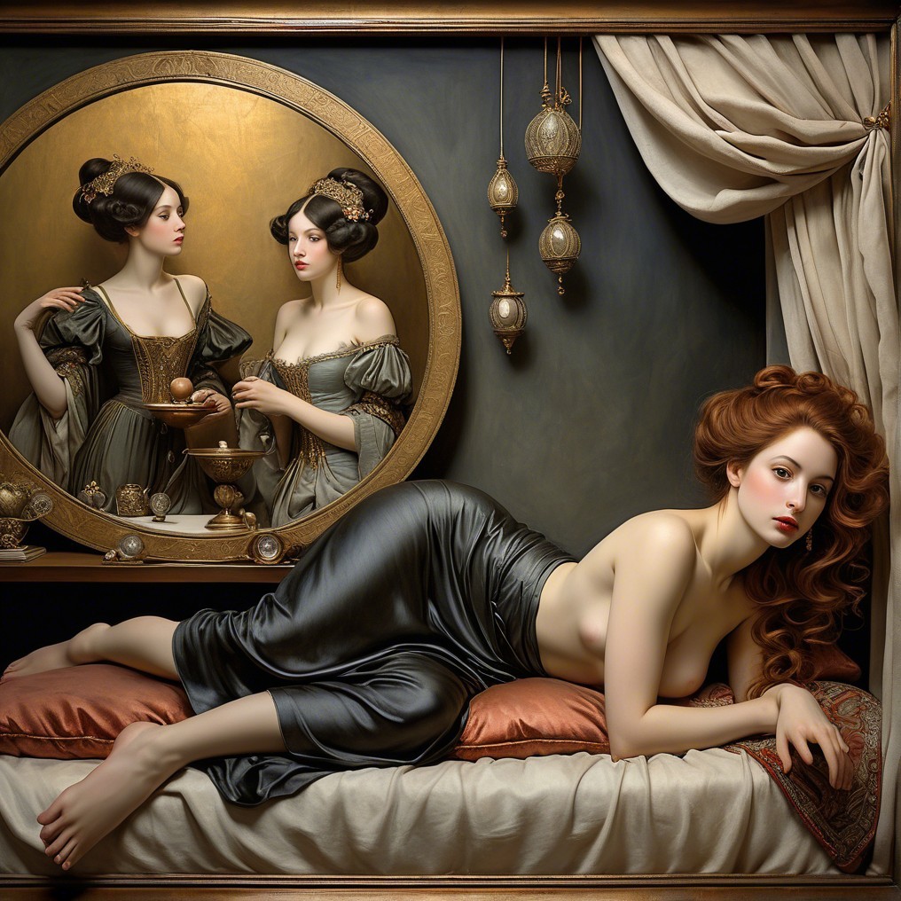 A vintage-inspired scene features a woman in a shimmering dress beside a mirror, reflecting another elegant figure. Soft lighting highlights ornate decor and rich textures, creating a timeless atmosphere.