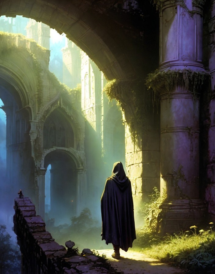 Prompt: "A lonely adventurer wearing a hooded cloak entering the ruins of a once splendid city now overgrown with vegetation, Dungeons and Dragons, Frank Frazetta, Luis Royo, Julie Bell, Boris Vallejo"