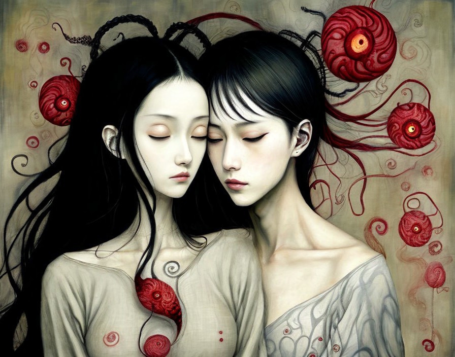Prompt: "Azami-Uzumaki Meli Isalu" - all on one image : {Junji Ito & Miyoko Ito by Leonora Carrington art by Eric Lacombe & by Endre Penovac & by Takato Yamamoto} : all on one image : perpetual cycles doodle naive art 4D comical ultra super wide lens portrait of beautifully very exaggerated grotesquely shaped proportioned caricature illustration of an occult summoner cat that summons infernal beings, the apple of knowledge, psychobacter immobilis rebuild by Francisco Goya artistically shaped by Basil Wolverton and by Gerald Scarfe, of most popular Cartoon Network art style Kim Possible, dressed in colorful vectors recreated Into 3D Caricatures By Gabriel Soares