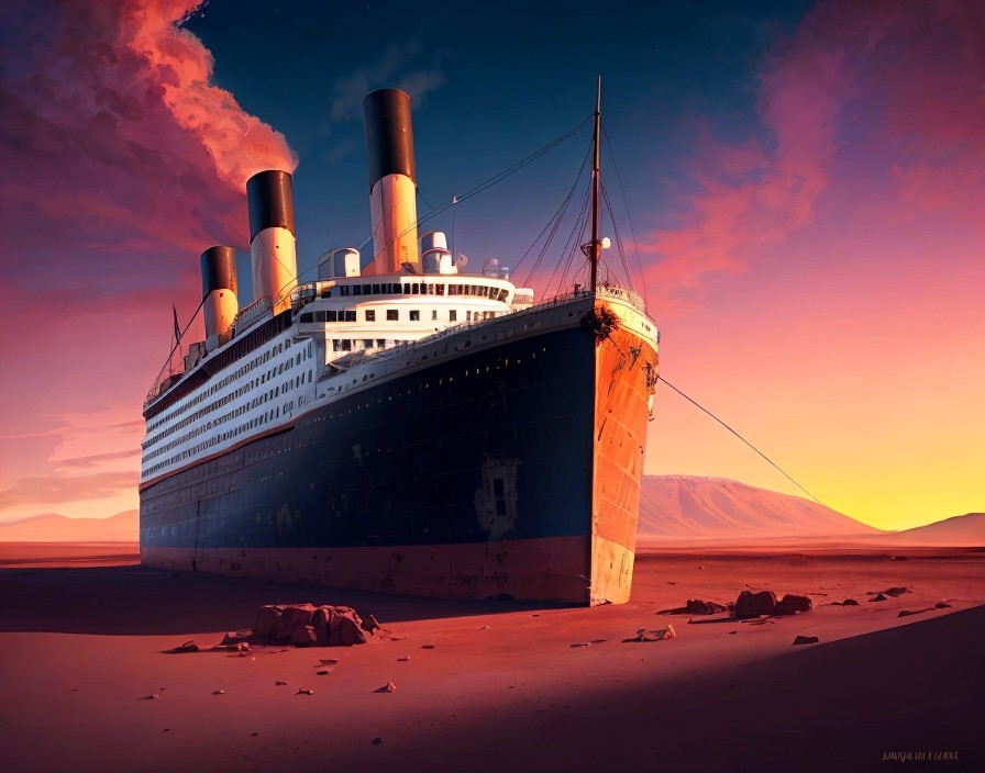 A digital artwork of the Titanic in a desert with a dramatic sunset sky.