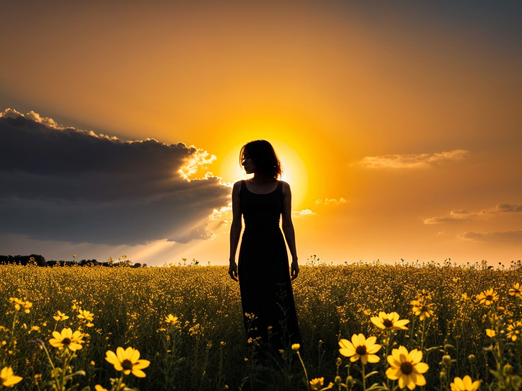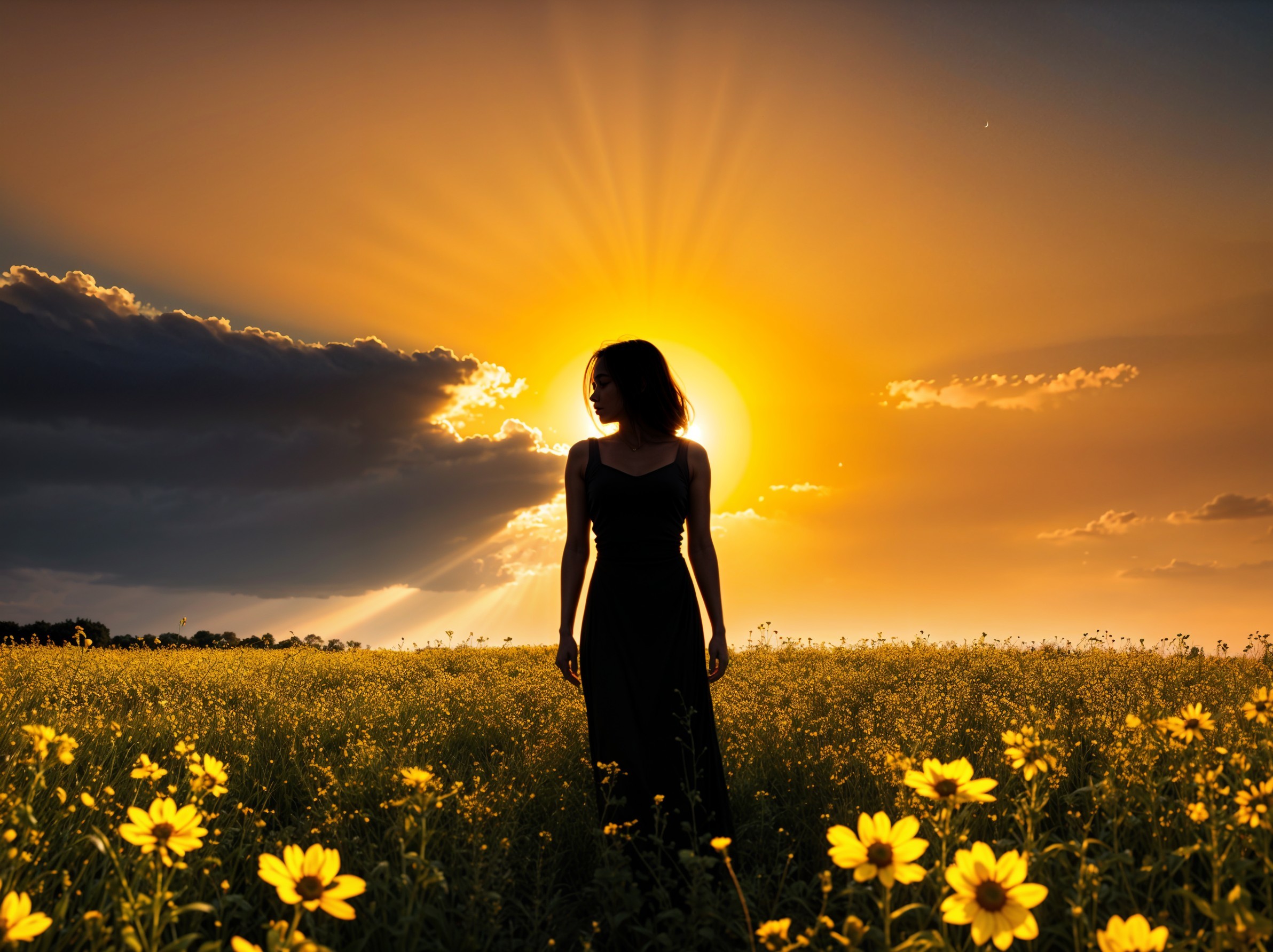 A silhouette of a woman in a black dress stands in a vibrant field of yellow flowers, illuminated by a stunning sunset with rays of light breaking through the clouds.