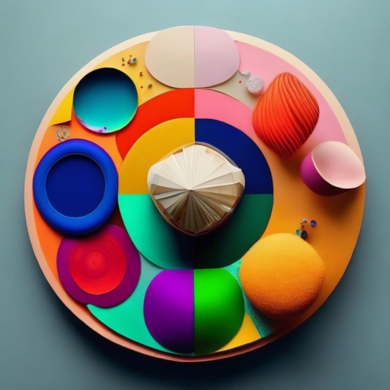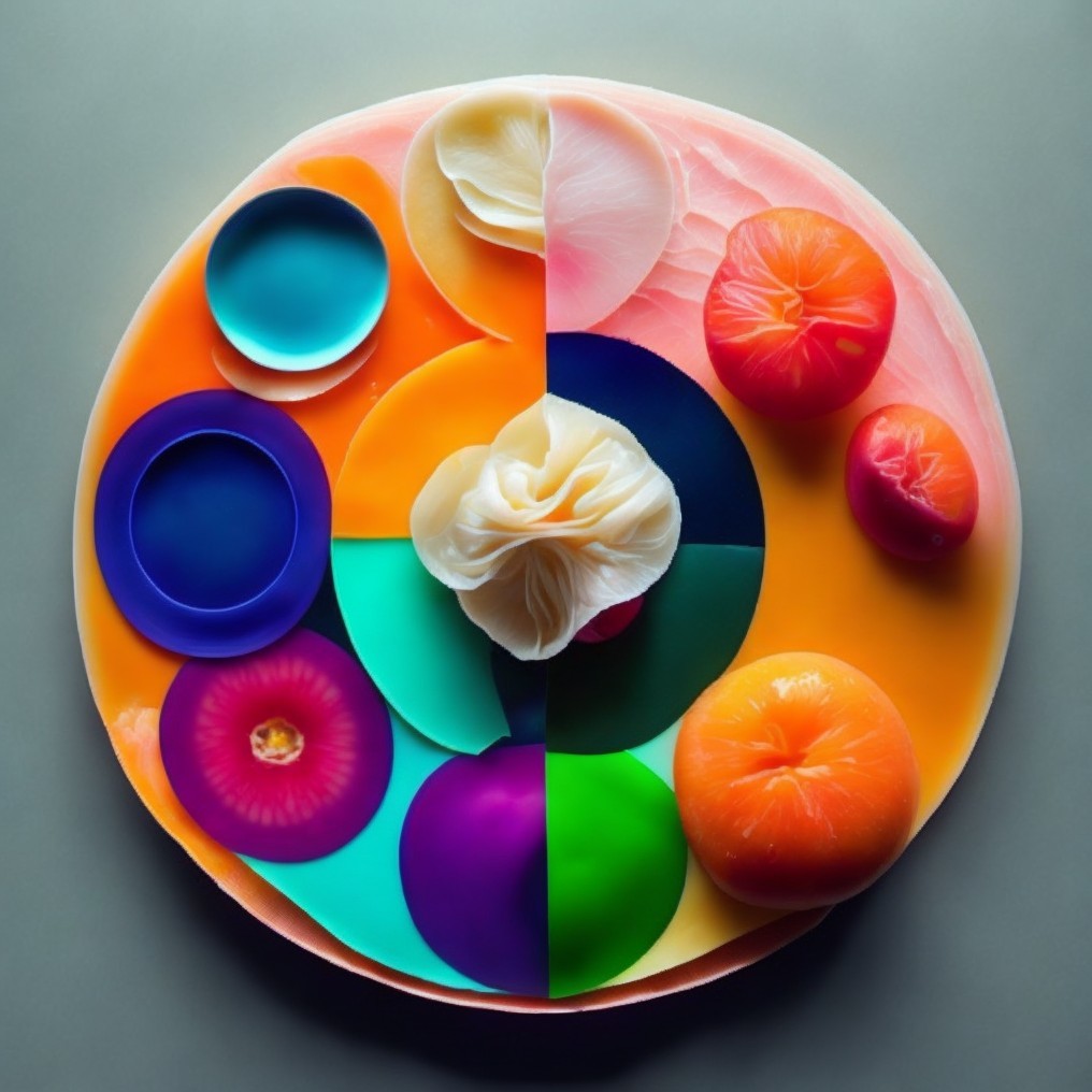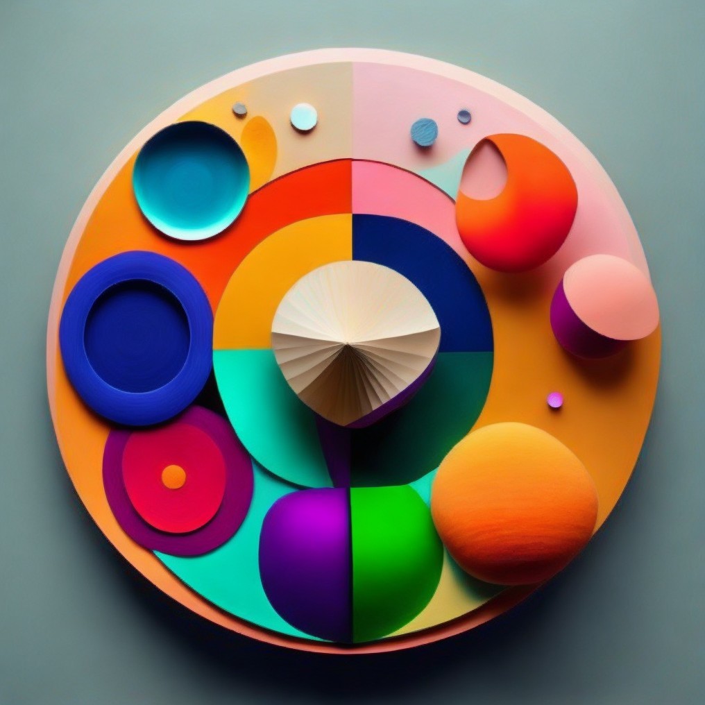 Geometric and organic shapes in harmonious colors with symmetry and depth.
