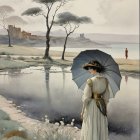 A solitary figure in a long coat stands by a tranquil pond, holding an umbrella. In the background, rolling hills and a distant village are framed by a cloudy sky, creating a serene atmosphere.