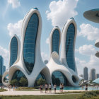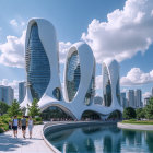 The image showcases a modern architectural marvel featuring sleek, curvy skyscrapers reflecting the sky. They’re surrounded by lush greenery and a serene water body, creating a stunning urban landscape.