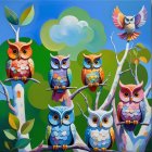A vibrant, colorful artwork featuring a group of seven stylized owls perched on branches, surrounded by lush greenery and a bright blue sky with fluffy clouds.