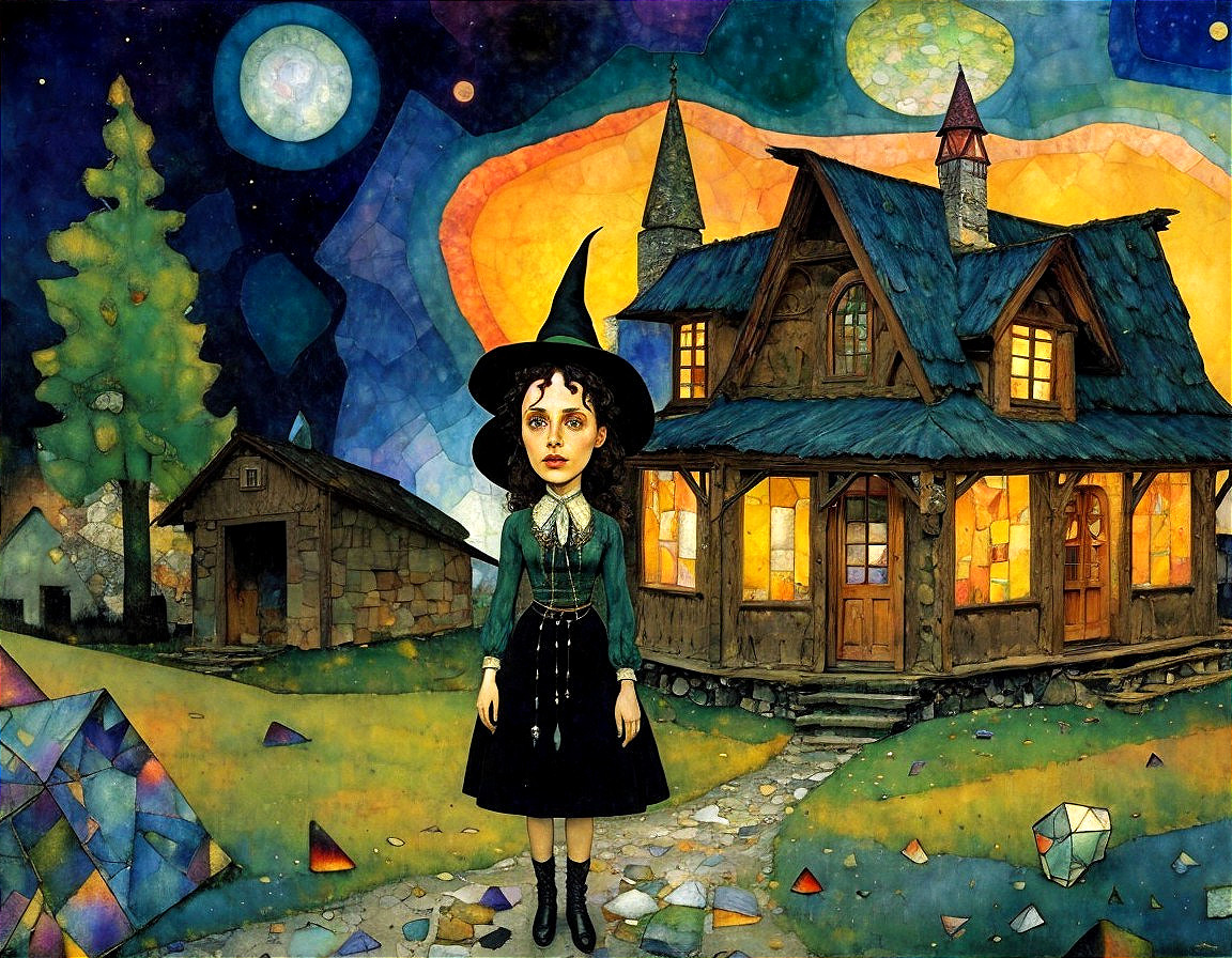 Prompt: beautiful witch, huge hat, stone cabin, cosmic background, ethnically varied skin, by Egon Schiele, Paul Klee mixed media, depth of field, parts of background made out of glass shards, metallic ink details and realistic textures created by Dave McKean and Richard Corben