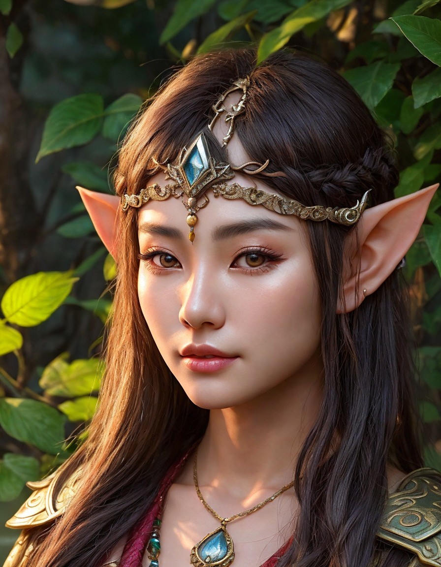 Female elf digital artwork with gold headdress and jewelry in leafy setting
