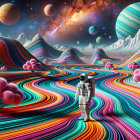 An astronaut stands on colorful, wavy landscapes dotted with pink cherry blossom trees, under a vibrant sky with distant planets and stars amidst majestic mountains.
