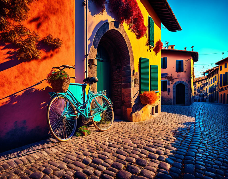 Colorful cobblestone street with blue bicycle and vibrant buildings.