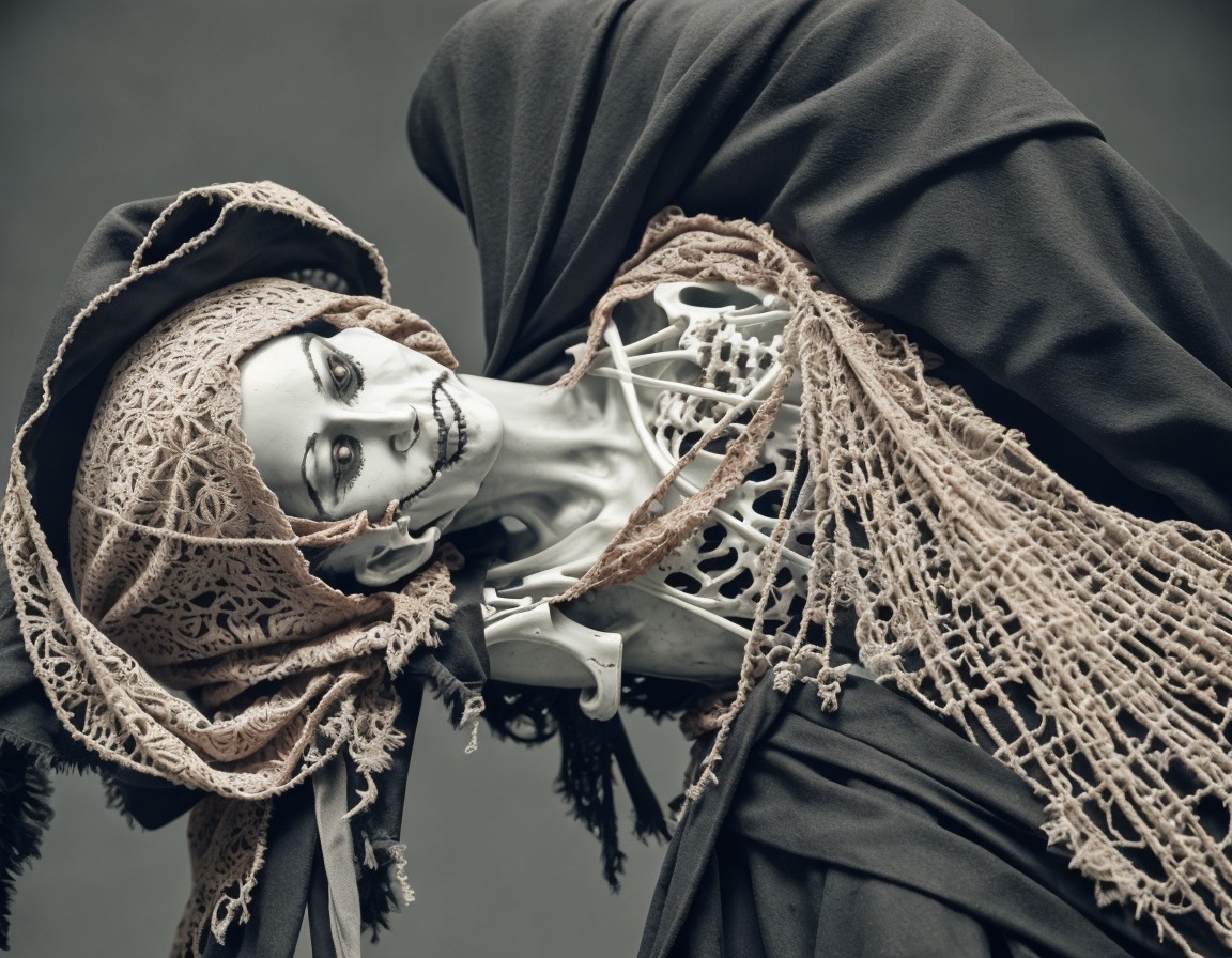 A skeletal figure draped in tattered shawls with a haunting skull face on a gray background.