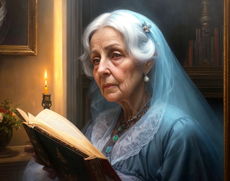 Prompt: Detailed oil on canvas painting portrait of Eldritch blurry misty shadowy smoky vintage crooked semi-diaphanous limpid old-granny-ghost with bright blue-glowing eyes in old playing room reading book for sleeping kids, night mist glowing, glowing candles, edwardian home playing kid's room design, stuffed toys, by Omar Rayyan, Jordan Grimmer, Rafal Olbinski, Goya