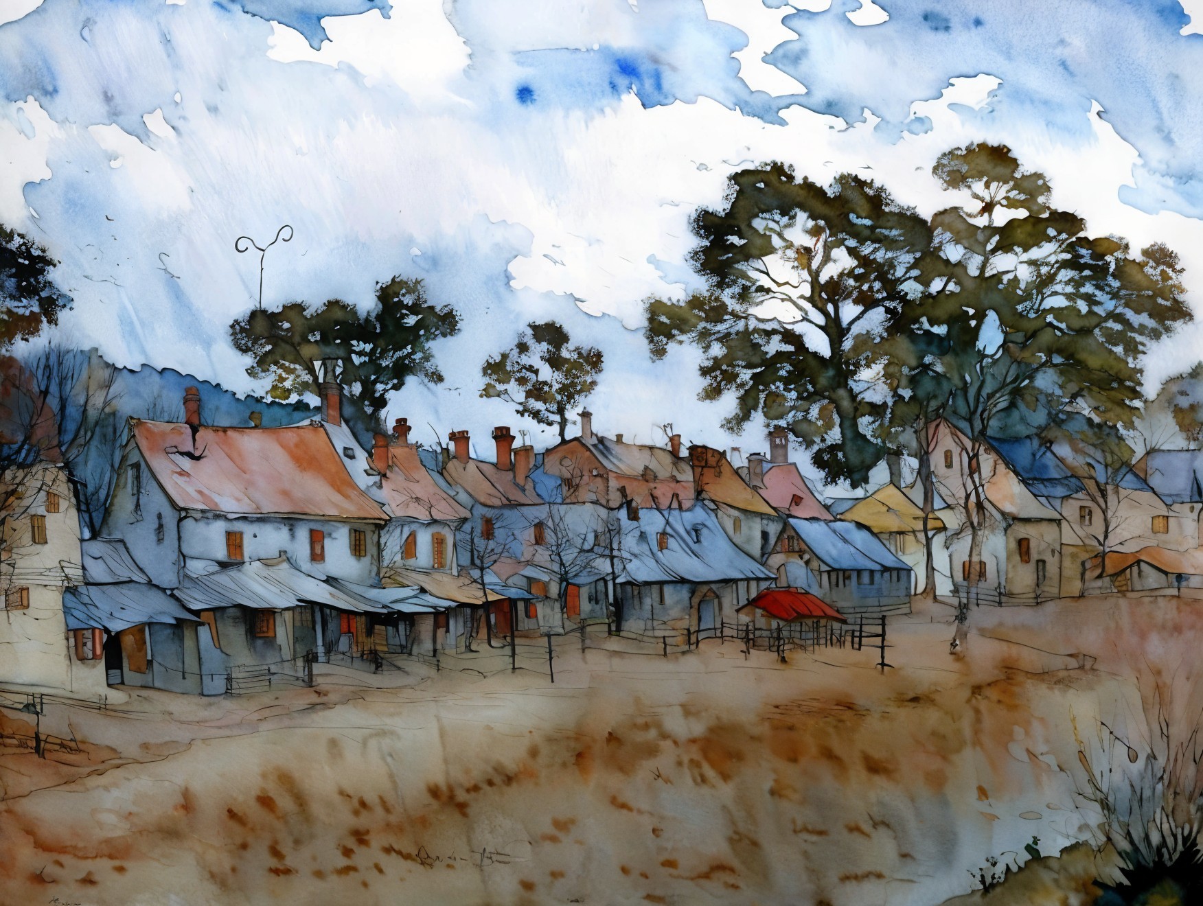 A watercolor scene depicts a bustling market square with quaint houses and trees. People in vintage attire stroll through the square, carrying bags, under a cloudy sky.