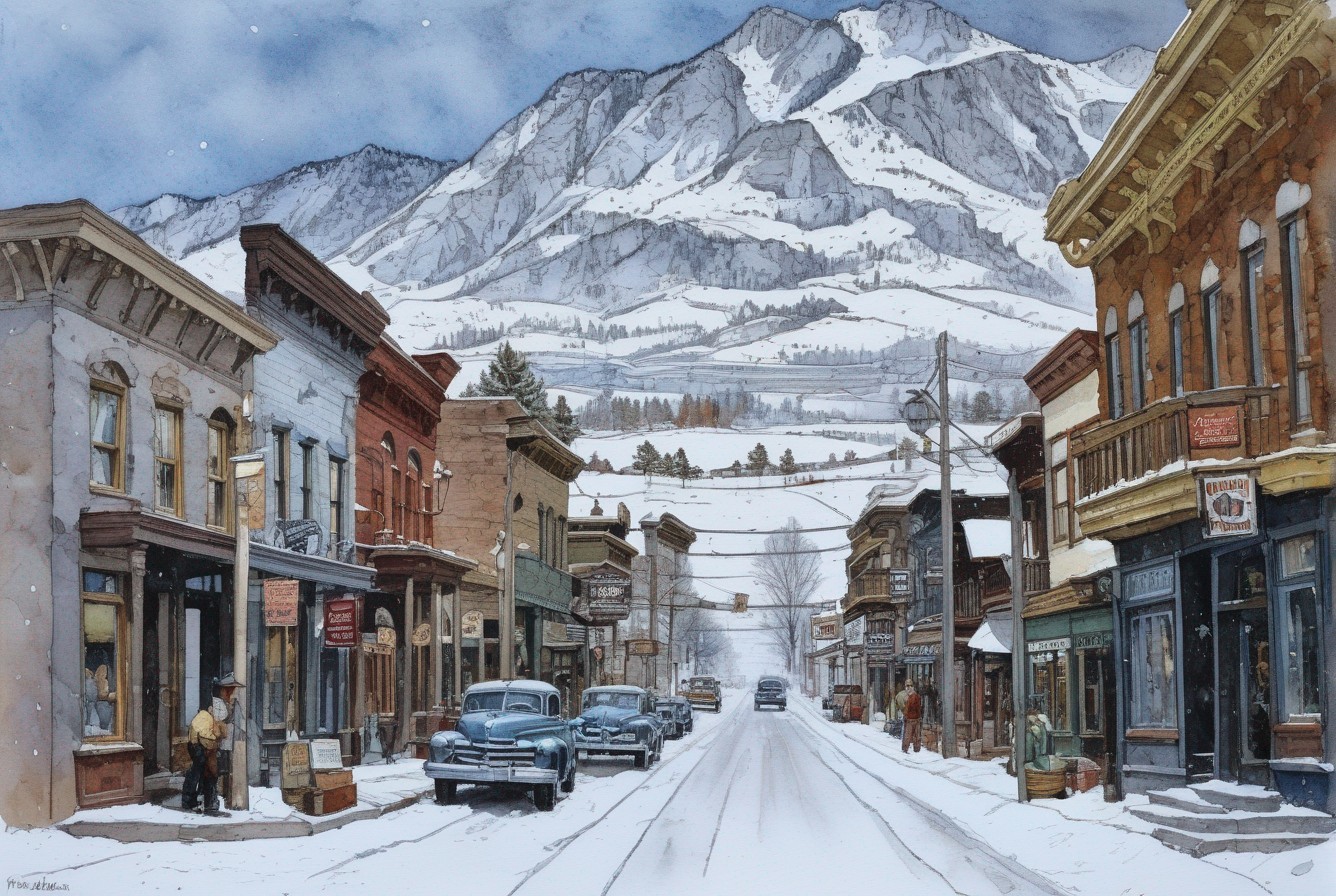 + Prompt:Street scene in in a small Colorado town, trees, a mountain background. watercolor, colored, calligraphic line, pen, black ink, intricate detail, full color, Idealistic. Norman Rockwell Illustration.