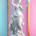 The image features a classic white statue of a woman draped in flowing garments, holding feathers and spheres, framed by a sleek golden border against pastel pink and blue backgrounds.
