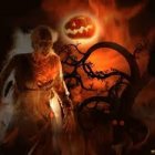Two ethereal figures with skeletal faces and fiery heads emerge from a mystical forest, draped in flowing dresses. The scene is illuminated by flames, creating a haunting yet captivating atmosphere.