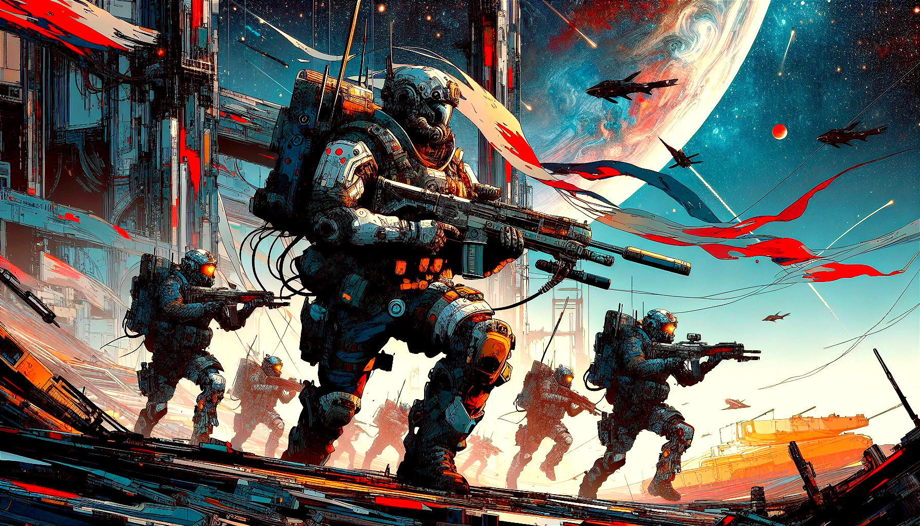 An ultra-detailed 8k futuristic war scene in Tony Moore style, created by artist Sam Rajabi. The masterpiece features crisp quality, high-definition realism, and is perfect for an 8k wallpaper.