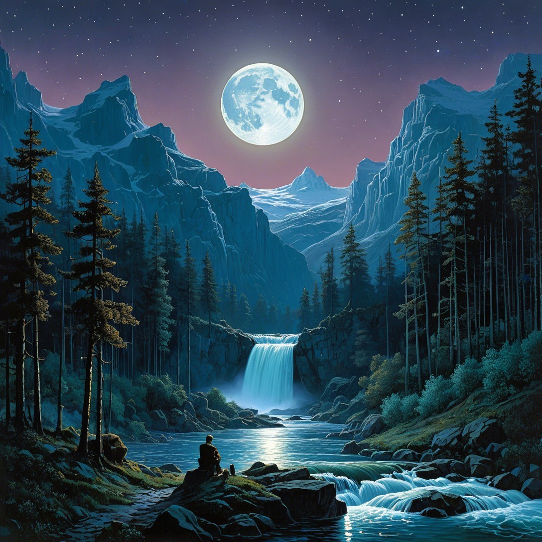 Two figures stand near a cascading waterfall under a bright full moon. Surrounded by towering trees and mountains, the serene night scene is illuminated by soft, ethereal moonlight.