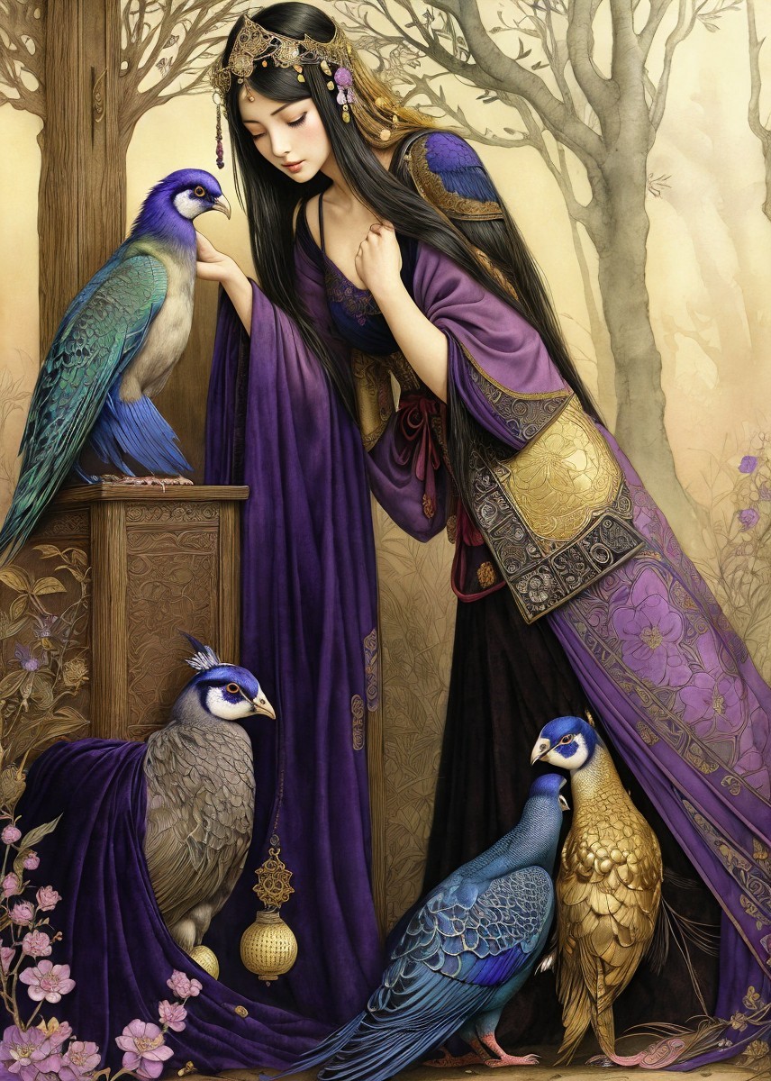 Beautiful woman tending her peacocks. Medieval Japanese Artists Sumi-e Style, purple, indigo, Ruby red, Velvet Black, Shabby, Dull Gold, Amber Gray, Golden Ratio, Surreal Fantasy, Elegant, High Definition Ultra Fine 3D Line, Zenangle Style, Watercolor Patchwork , Arthur Rackham Style, Paul Kidby, , Jacek yerka, Extremely Detailed, Intricate, Thoughtful, HDR, Fractal, Beautiful, Award Winning, Fantasy Look, Fantasy, Crisp Quality