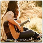A young woman sits on grass, playing an acoustic guitar amidst colorful autumn leaves, enjoying the serene atmosphere of a sunny park. Natural light enhances the peaceful vibe.