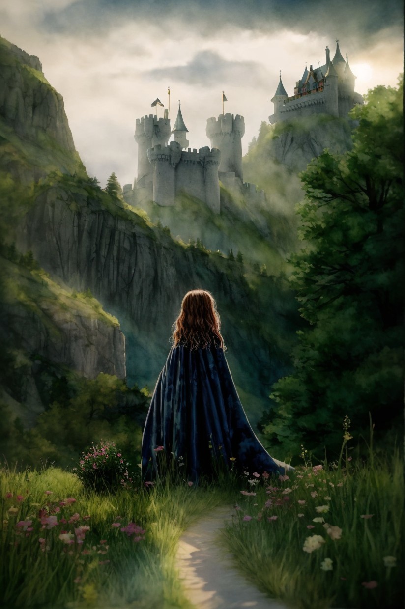 Person in blue gown gazes at misty castle on cliff