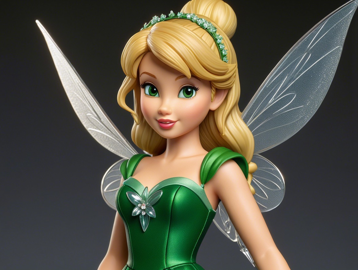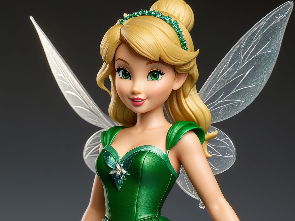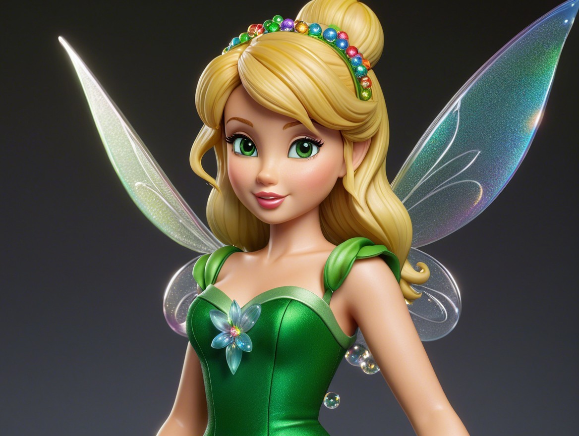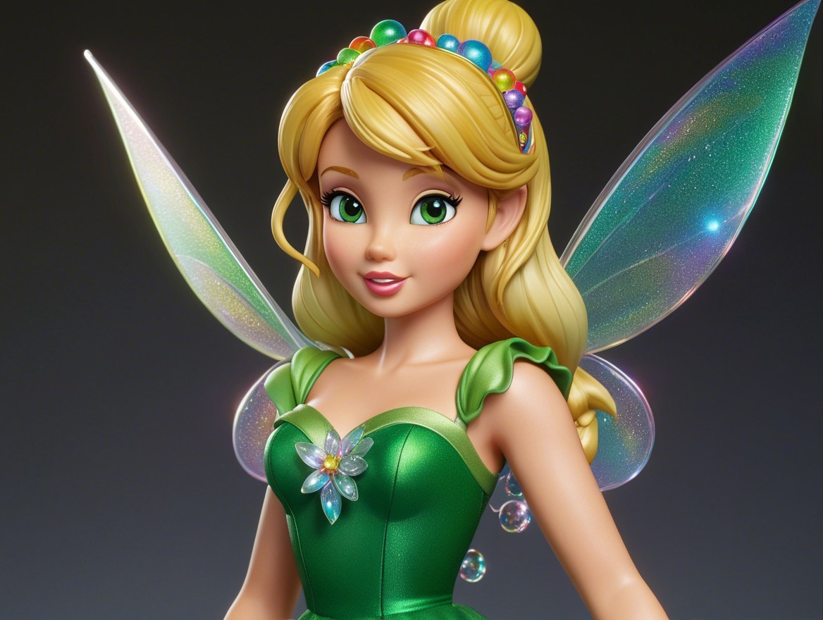 The image features a cheerful fairy with shimmering green wings, bright green dress, and playful golden hair adorned with colorful beads. She has large, expressive eyes and a sparkling smile.