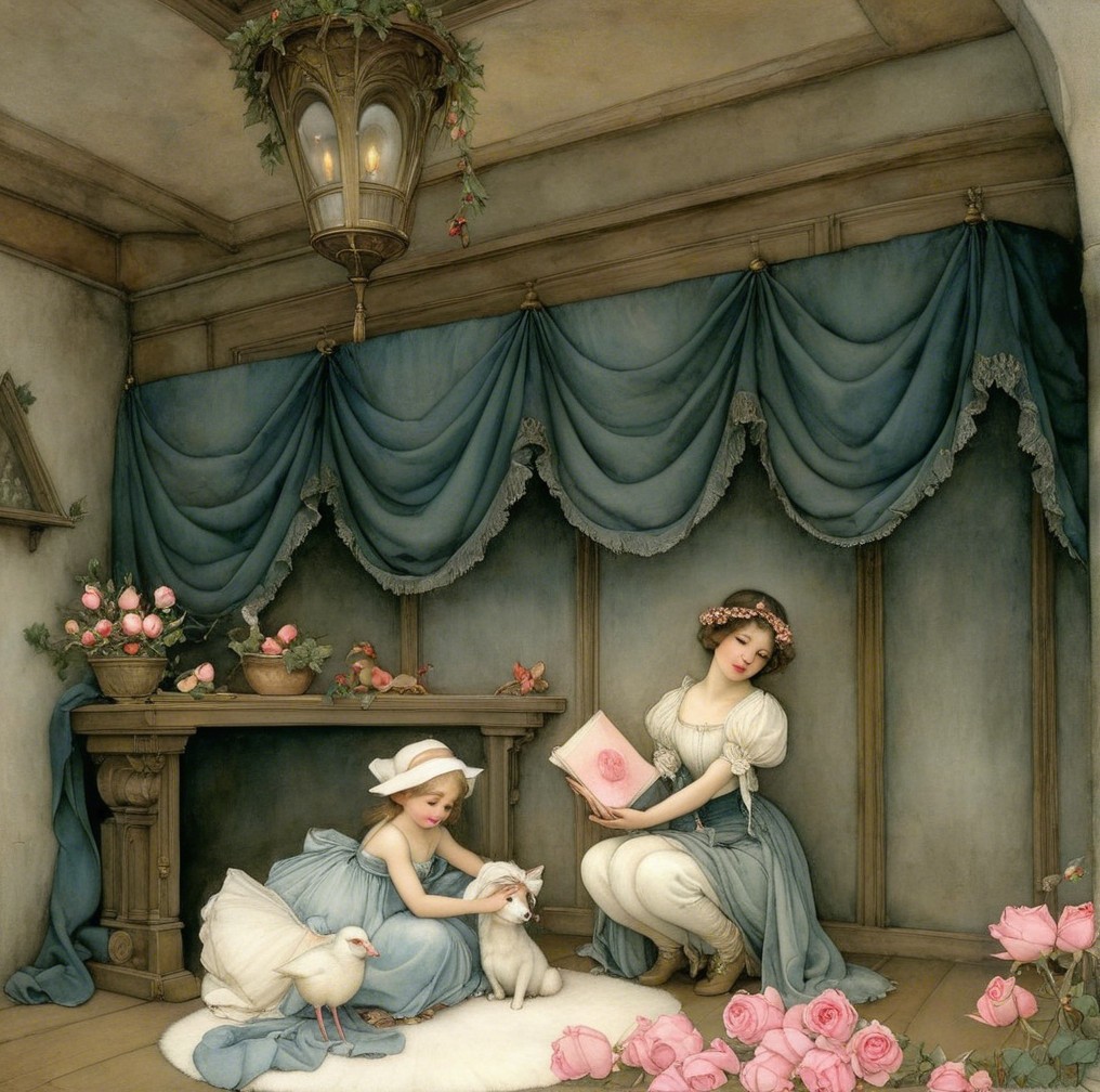 A serene young woman rests on a pillow, surrounded by blooming roses. She wears a soft gown, gazing thoughtfully. The background features delicate drapery and a starry night, creating a dreamy atmosphere.