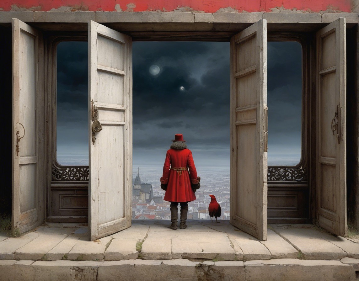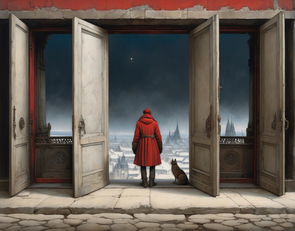 I always, here is how the AI sees our work: "A person in a red coat and a cat look out large open doors to a snowy cityscape under a crescent moon."