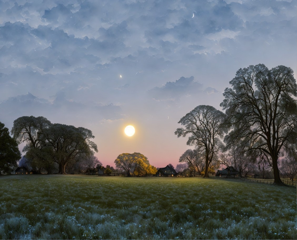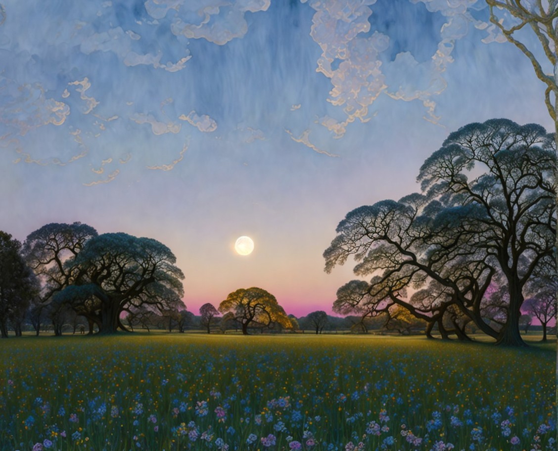 A serene landscape features vibrant trees silhouetted against a colorful sunset, with a glowing moon and starry sky, creating a dreamy, tranquil atmosphere filled with blooming flowers.