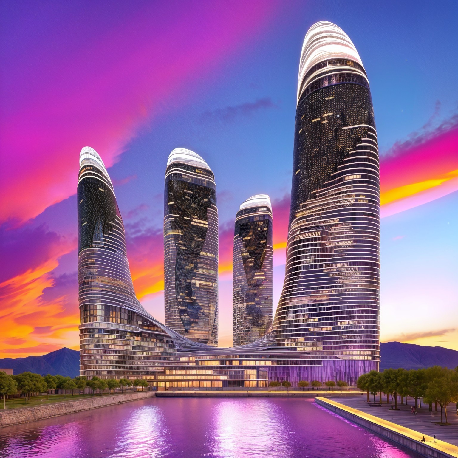 Create a stunning view of futuristic skyscrapers with sleek, organic shapes, reflecting vibrant colors of a sunset in the sky. The buildings should appear to flow and curve gracefully, surrounded by a tranquil waterway. Include a picturesque city skyline in the background, with lush greenery along the riverbank. The overall atmosphere should evoke a sense of innovation and harmony between nature and architecture, illuminated with soft, ambient lighting and dynamic colors that range from deep purples to warm oranges.