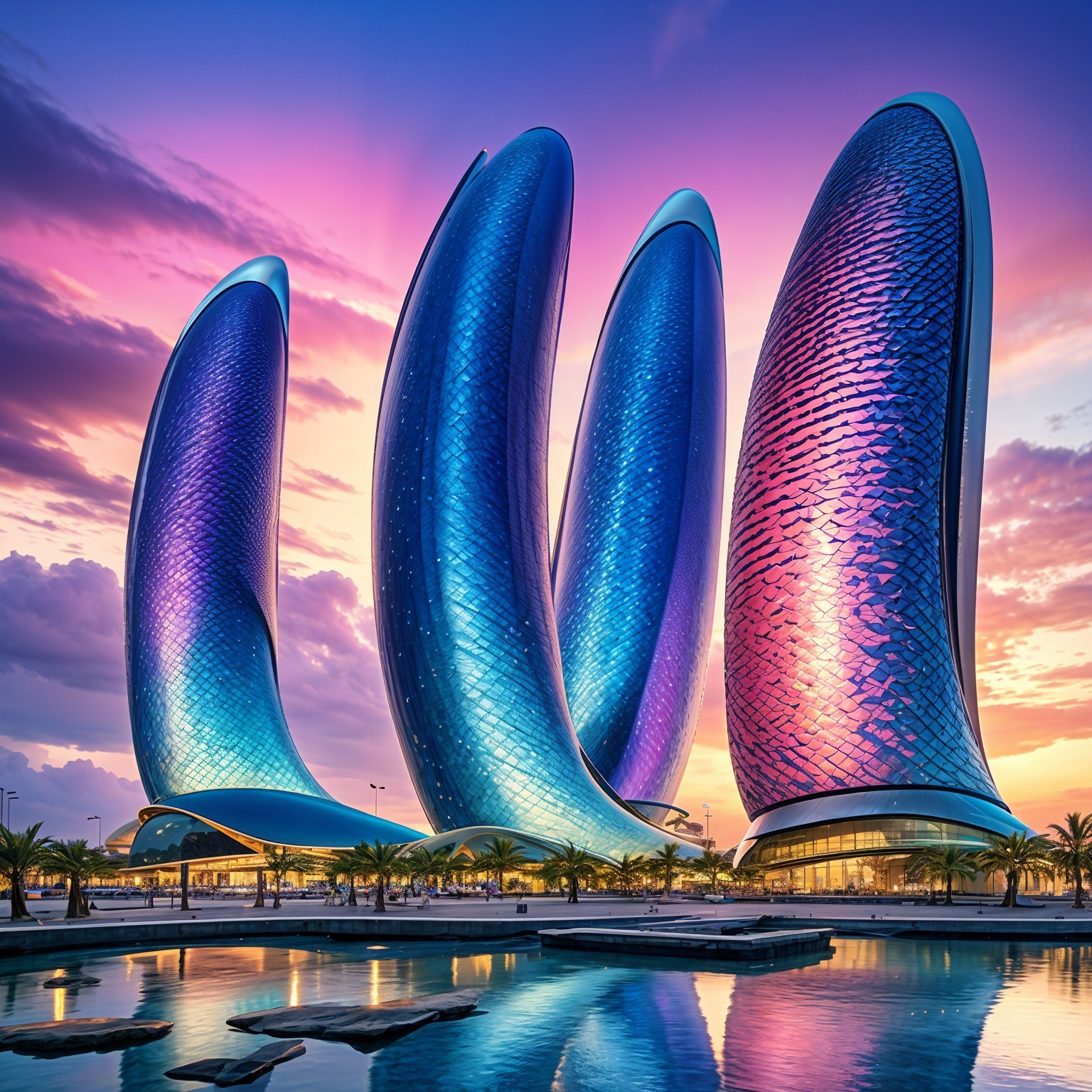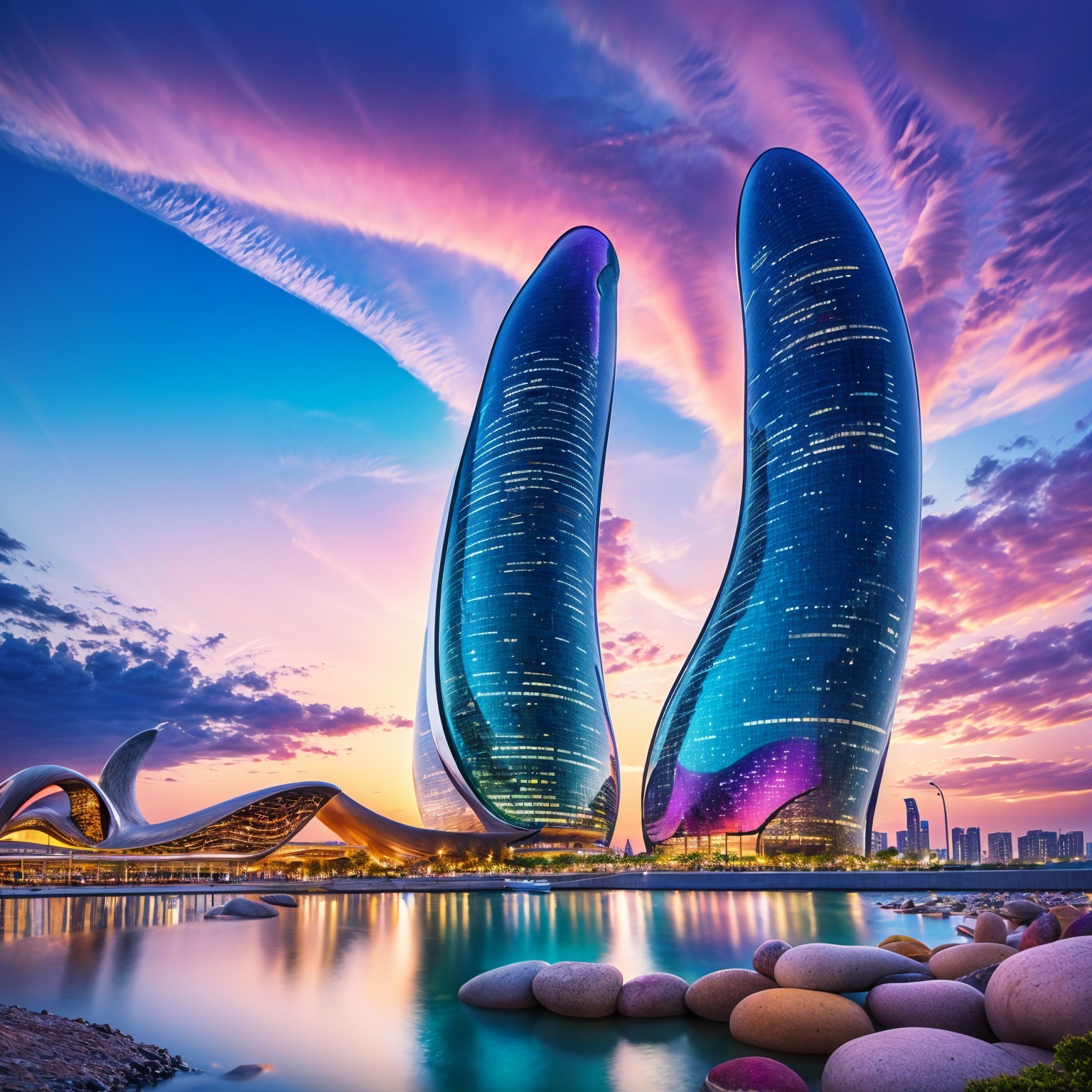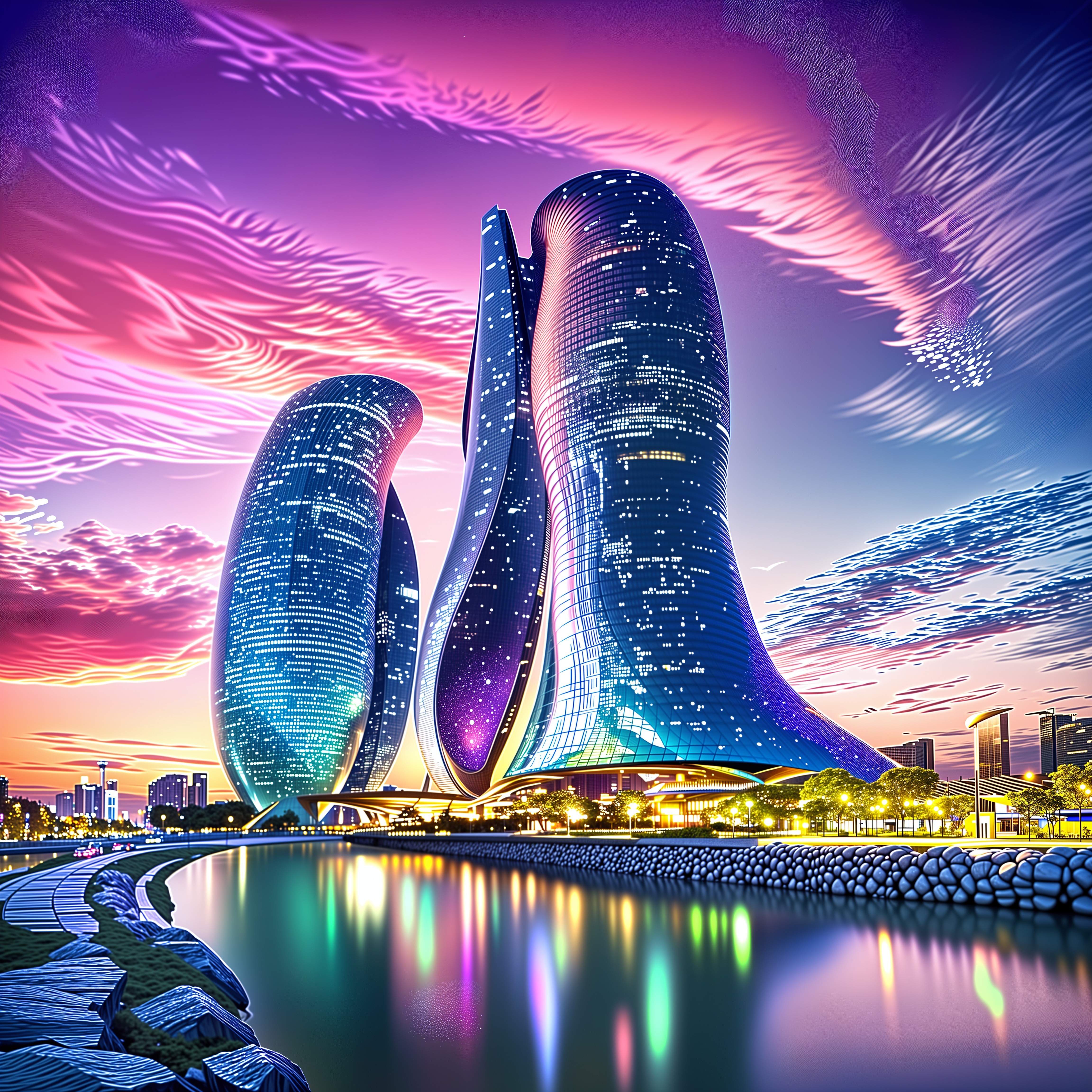 A futuristic skyline features sleek, twisting skyscrapers illuminated by vibrant colors against a twilight sky, reflecting on a calm river, creating a stunning urban landscape.