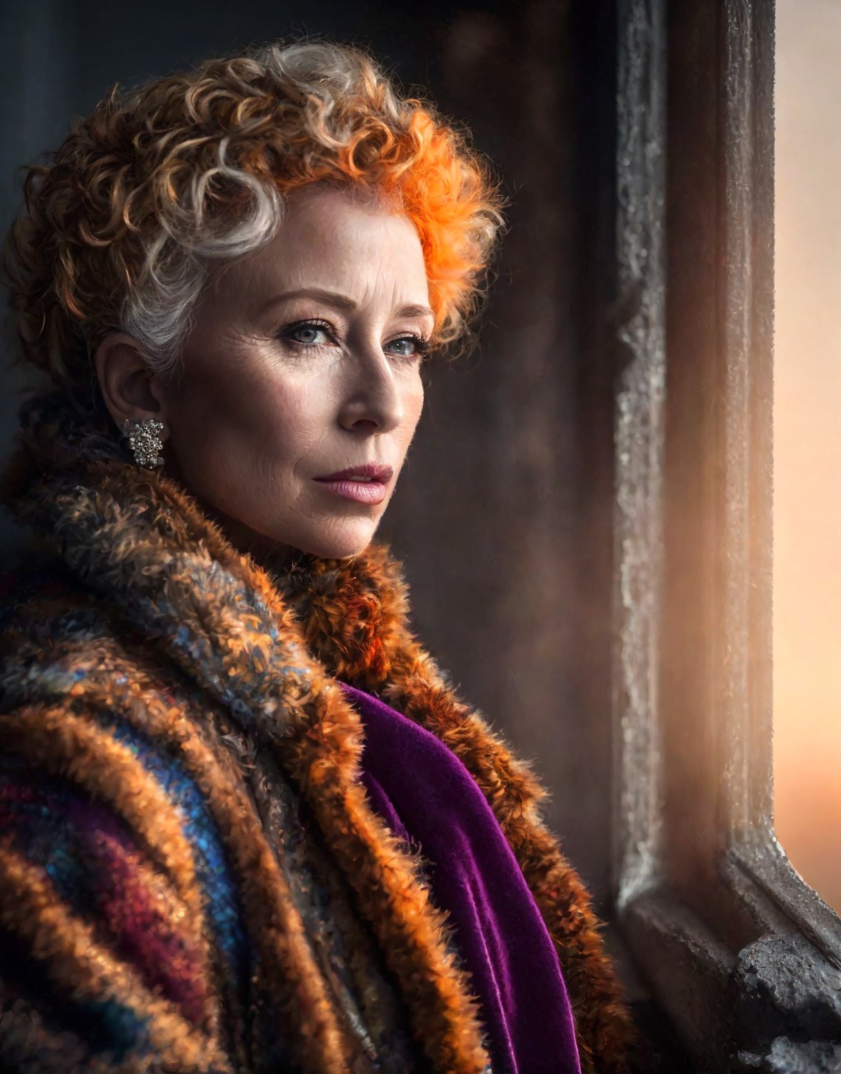 A woman with short, curly hair in vibrant orange and blonde stands by a window, wearing a luxurious fur coat. She gazes thoughtfully outside, illuminated by warm, soft light.