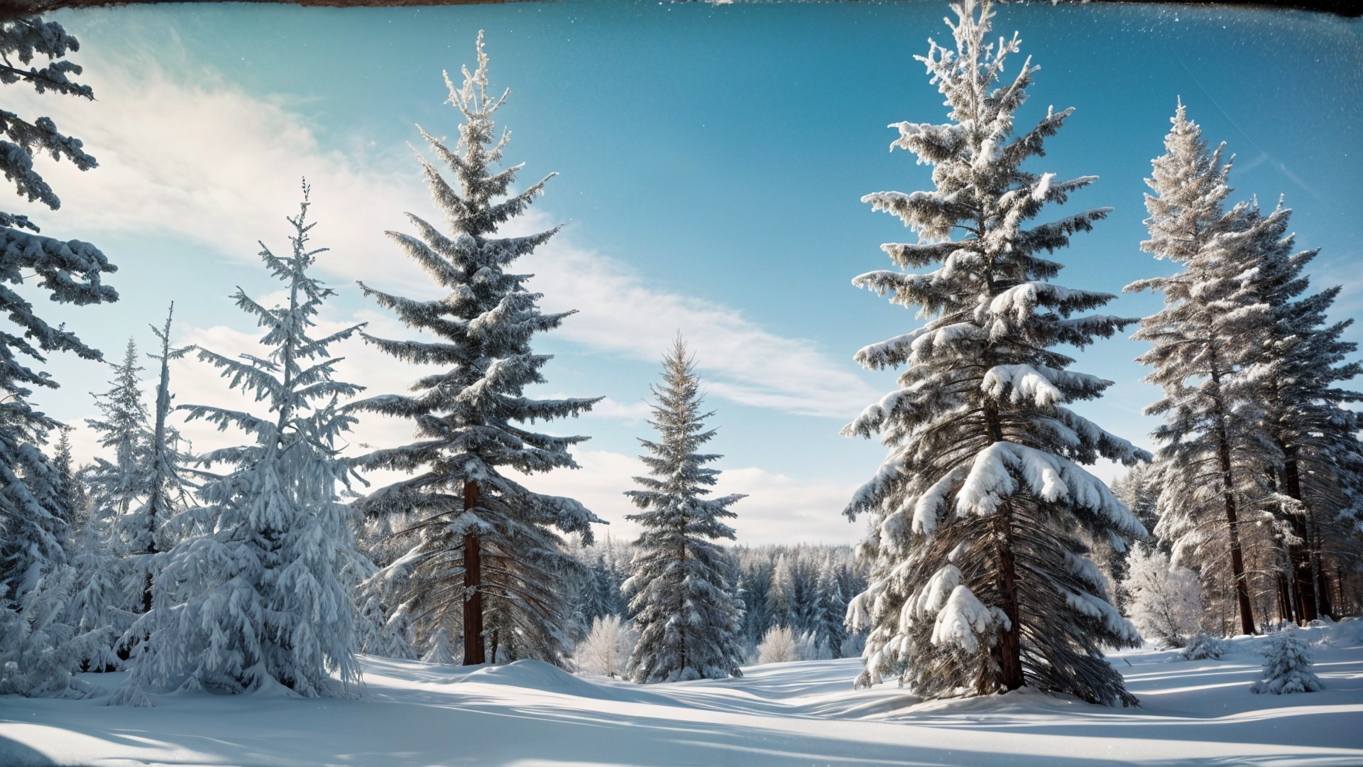 A serene winter landscape featuring tall evergreen trees blanketed in snow. The bright blue sky contrasts with the white snow, creating a peaceful and picturesque scene.