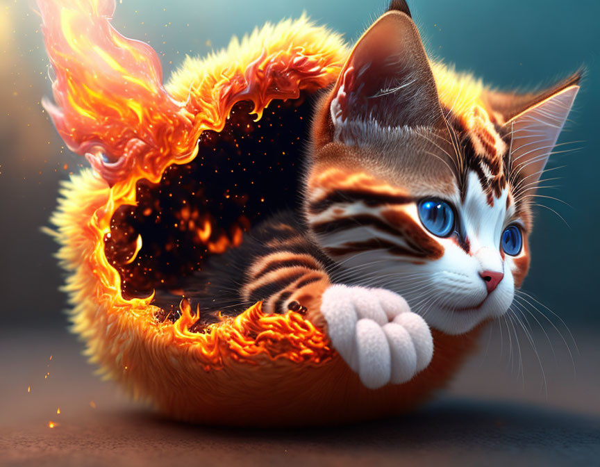 Digital Artwork: Cute Kitten with Blue Eyes and Flaming Fur